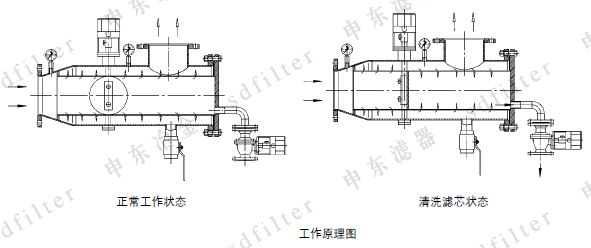 本過濾器主要由優質碳鋼或不銹鋼筒體、Johnson濾網、水流導向閥、差壓控制器、電動控制箱及排污裝置等所組成。當過濾器工作時,水流導向閥處于開啟狀態,水流由入口進入過濾器,經濾網過濾后流入出口。本機采用壓差控制、定時控制自動清洗濾網。當過濾器進出口壓差達設定值或定時器達到預置時間時,電動控制箱發出信號,排污閥打開(水流導向閥處于開啟狀態),水流沖洗粘在濾網壁上的雜質,雜質由排污口排出。稍后水流導向閥開始關閉(排污閥處于開啟狀態),水流在導向閥關閉過程中流速不斷加大,粘附在濾網內壁上的雜質被進一步沖洗排出,當水流導向閥處于全關狀態下,水流被迫從過濾器進口段網孔進入濾網外側,大部分凈液從出口流出,一部分凈液又從濾網外側進入濾網內部(因為系統處于泄壓狀態,濾網內部壓力小于外側壓力),從而對濾網進行反沖洗,特殊設計的J o h n s o n網使得在濾網內部產生了噴射效果,任何雜質都被從光滑的內壁上沖走。當過濾器進出口壓差恢復正常或定時器設定時間結束后,電動排污閥關閉,水流導向閥開啟。整個過程中,物料不斷流,實現了連續化、自動化生產。