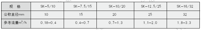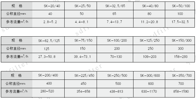 標(biāo)準(zhǔn)的SK型靜態(tài)混合器其水力直徑是混合器直徑的1/2。即分隔號前的數(shù)字表示水力直徑,分隔號后的數(shù)字表示公稱直徑。下面給出的是部分常用規(guī)格,表中所列參考流量是指普通粘度液體相混合時的流量,不適用于氣體和高粘度液體。對氣體、高粘度液體和氣/液體系需另經(jīng)專門的設(shè)計計算。