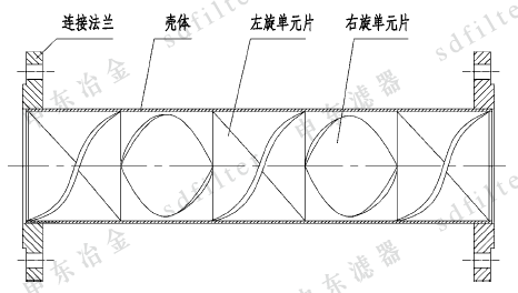 SK型靜態(tài)混合器又稱單螺旋形靜態(tài)混合器,它的單元是扭轉(zhuǎn)180°或270°的螺旋板,安裝入管殼時相鄰的螺旋板分別為左旋和右旋。與S V型靜態(tài)混合器相比,S K型的混合效果較差,且有明顯的放大效應(yīng),但是S K型不容易堵塞,適用于較臟的物料。用于乳化過程時能使液滴分散到10μ m,用于一般的混合過程不均勻度系數(shù)αX≤5%。