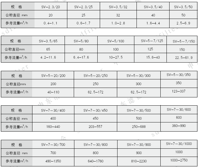 國內已經有二米直徑的靜態混合器投入工業應用,國外則有更大直徑的靜態混合器投入使用。下面給出的是部分常用規格,表中所列參考流量是指普通粘度液體相混合時的流量,不適用于氣體和高粘度液體。對氣體、高粘度液體和氣/液體系需另經專門的設計計算。