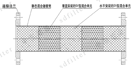 SV型靜態混合器內部單元是由精心設計的波紋片組裝而成,它能使不同流體在三維空間內作Z字形流動,各自分散彼此混合。在各種型號的靜態混合器中,S V型的混合************,用于乳化過程時能使液滴分散到0.5-2μm,用于一般的混合過程不均勻度系數αX<1%,而且沒有放大效應。