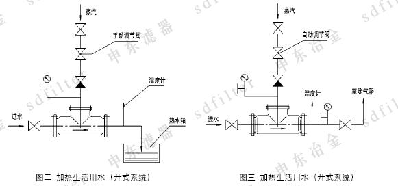 2、用于浴室加熱熱水送入水箱,代替熱水箱中原高噪聲、強振動的蒸汽直接加熱方式(花管)。(圖二)