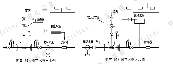 (五)在以電動泵為循環動力的熱水采暖系統中,本加熱器安裝在水泵進水側的條件: