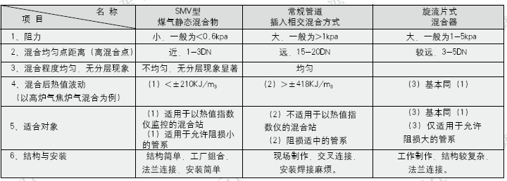 六、SMV型煤氣靜態混合器與常規煤氣混合站特性比較表
