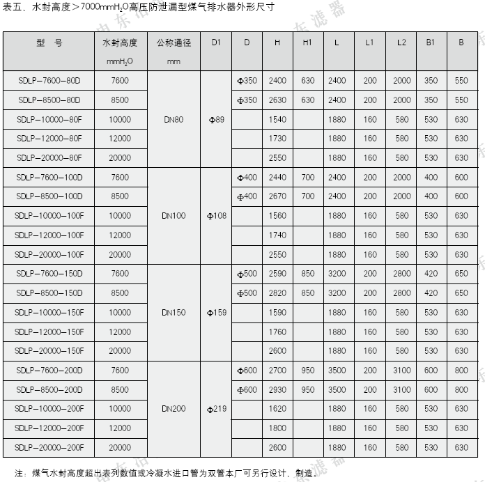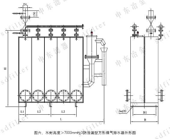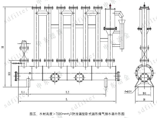 5、水封高度>7000mmH2O高壓多室排水器外形尺寸見圖五、圖六、表五