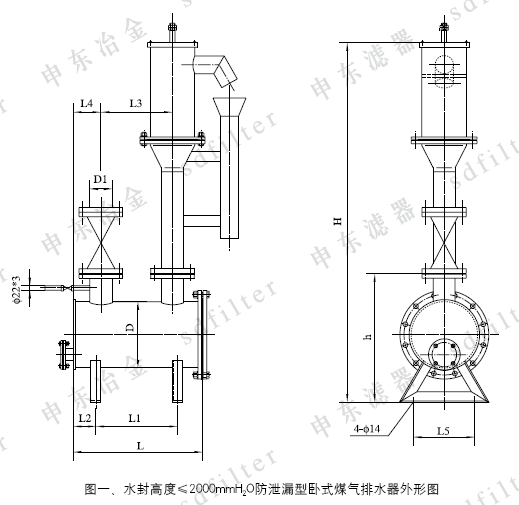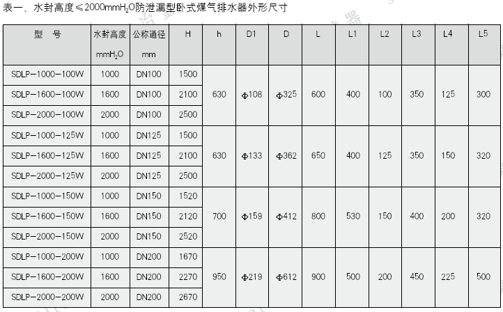 1、水封高度≤2000mmH2O臥式排水器外形尺寸見圖一、表一