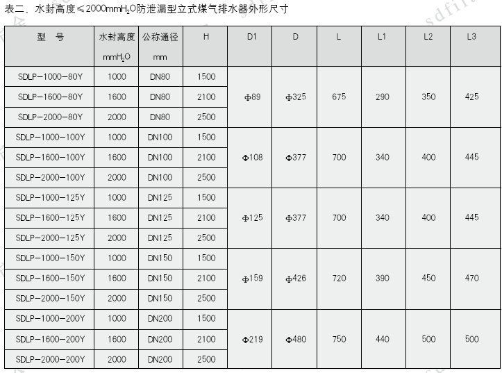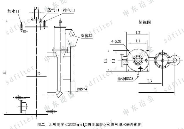 2、水封高度≤2000mmH2O立式圓形排水器外形尺寸見圖二、表二