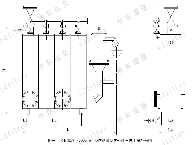 3、水封高度>2000mmH2O方形排水器外形尺寸見圖三、表三