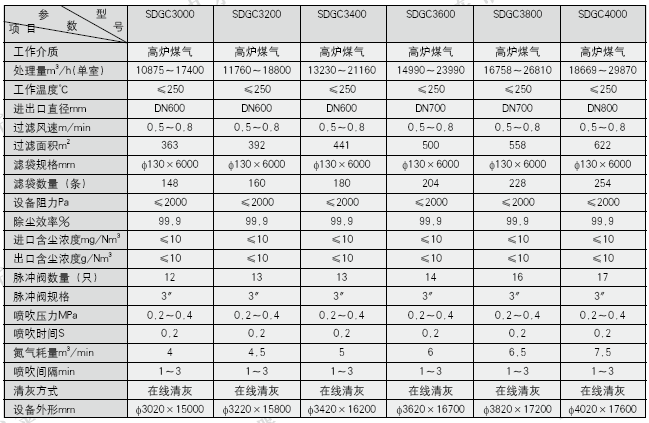 S D G C型高爐煤氣干法除塵器以“長袋脈沖袋式除塵器”的核心技術為基礎,強化過濾、清灰、安全防爆三項功能。采用可靠完備的自動控制功能,優化整體結構,延長濾袋等易損件的使用壽命,建立和完善使用操作與維修保養等一系列制度,適應高爐噴煤安全與連續生產需求的袋式除塵裝置。