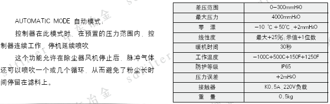 電子差壓儀DP-M I NI分別連接在除塵器的清潔側(cè)和污染側(cè),測(cè)量布袋之間的差壓值。該裝置顯示連接的差壓值并設(shè)定值輸出至控制器。 電子差壓儀DP-M I NI的主要組成部分是壓阻傳感器,該裝置已被線性化,并帶溫度補(bǔ)賞,這種雙重補(bǔ)賞的電路使電子差壓儀DP-MINI成為現(xiàn)代化精密儀表,電子差壓儀DP-MINI提供與除塵器連接的有關(guān)配件。